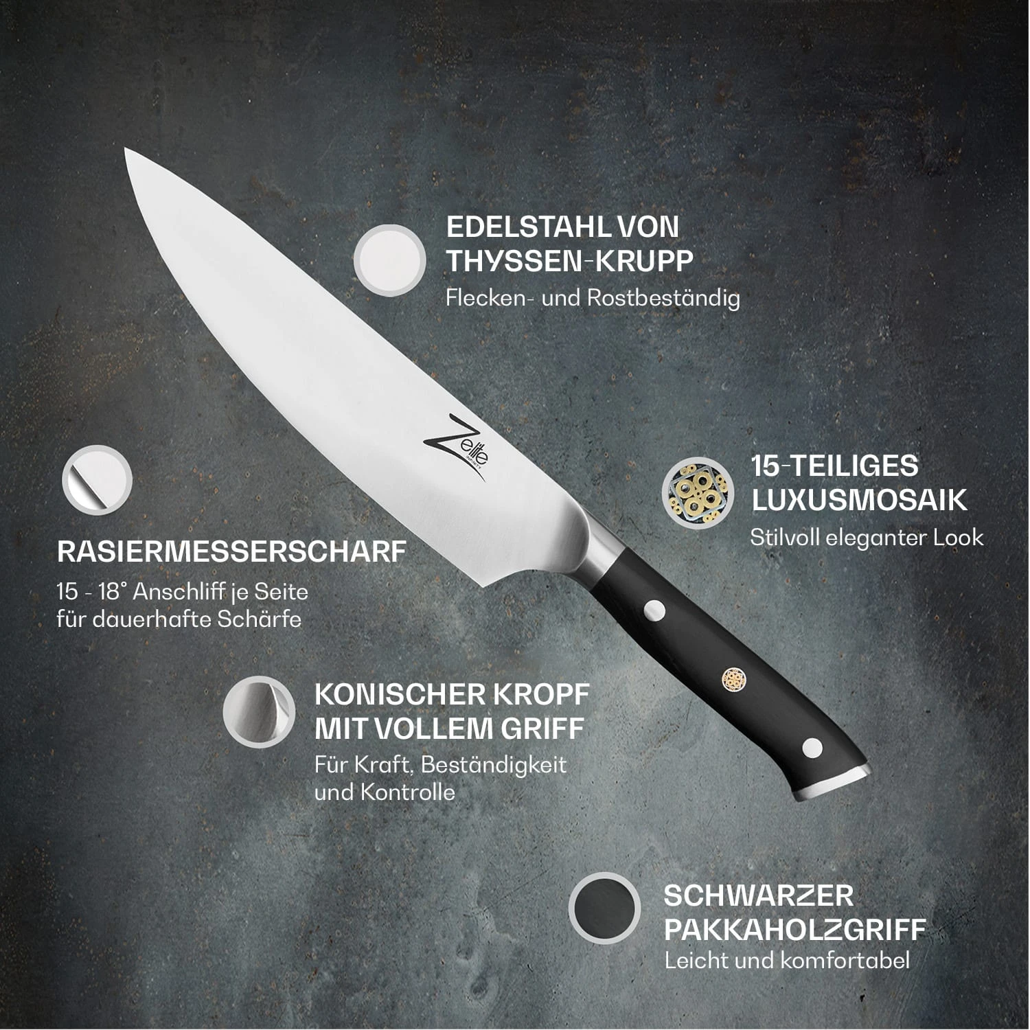 Gute und scharfe Messer sind ein Muss für Profiköche und all die, die gerne in der eigenen Küche Hand anlegen. Unsere Alpha-Royal German Messerserie von Zelite Infinity by Klarstein vereint hochwertige Materialien, perfekte Verarbeitung und edles Design zu Präzisionswerkzeugen, die dich im täglichen Kochgeschehen begeistern.