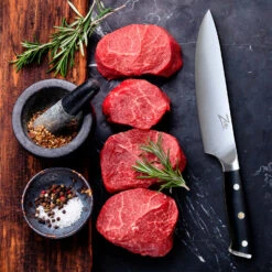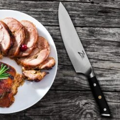 Das 8″ Kochmesser ist aus deutschem Qualitäts-Edelstahl von Thyssenkrupp und schwarzem Pakkaholz gefertigt. Der ergonomische, dreifach vernietete Griff ist mit einer Mosaikniete versehen und liegt beim Schneiden gut und sicher in der Hand. Die 8″ Klinge des Küchenmessers ist nicht nur ultrascharf und gleitet durch Fleisch wie durch warme Butter, sie ist auch ideal zum Schneiden von anderen Lebensmitteln wie Fisch, Gemüse oder Obst geeignet. Zusätzlich ist eine Lederscheide zum Schutz der Klinge im Lieferumfang enthalten.
