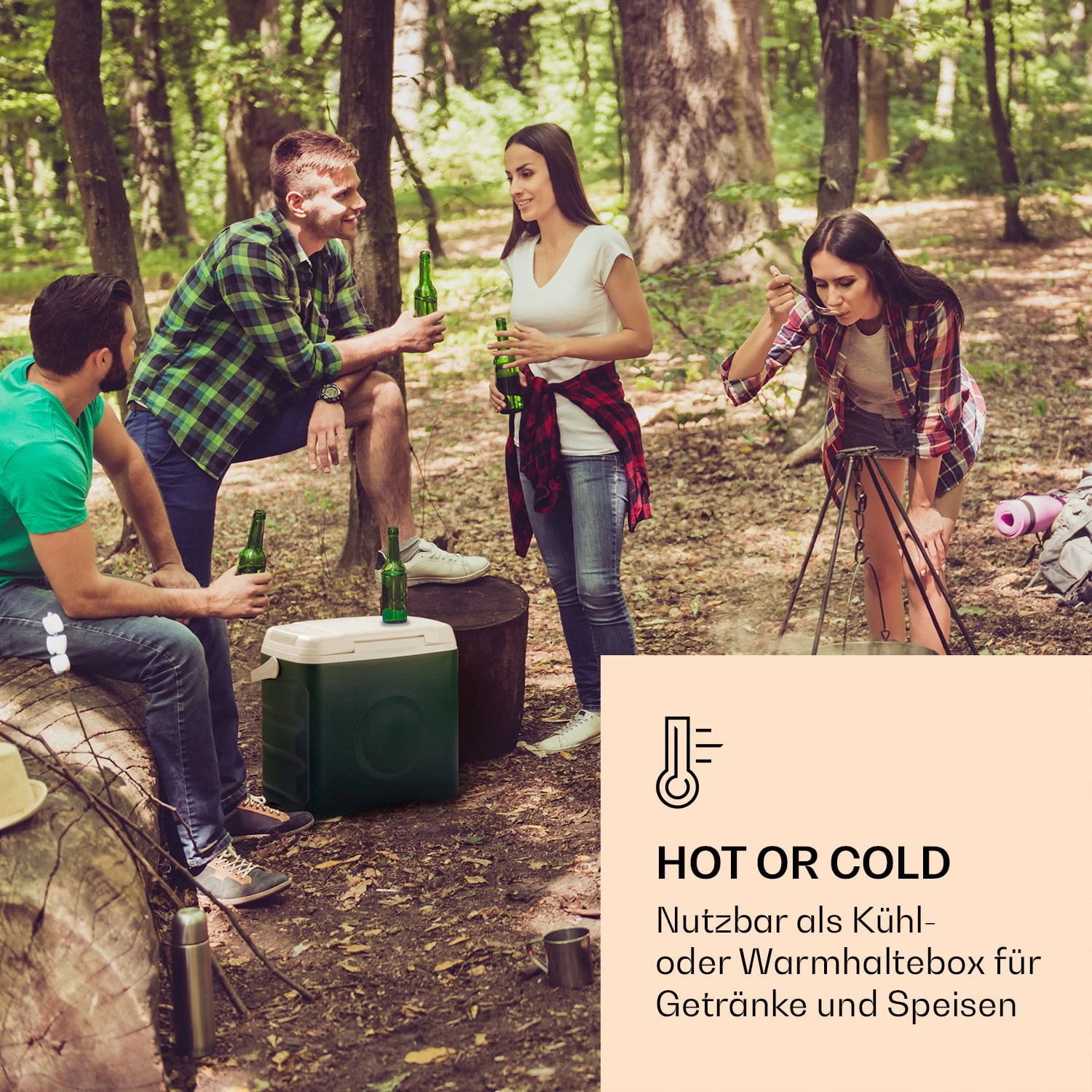 Hot or cold? Du hast die Wahl mit der praktischen Klarstein BeerBelly 29 Kühl- und Warmhaltebox. Die 44 x 44 x 28 cm (BxHxT) große Truhe ist dein idealer Begleiter bei langen Autofahrten, Festivals oder Picknicks. Flexibel nutzbar via Netzkabel, Zigarettenanzünder oder USB. Gehäuse und Deckel sind aus hochwertigem, lebensmittelechtem Kunststoff gefertigt. Der große Tragegriff dient gleichzeitig als sicherer Verschluss.