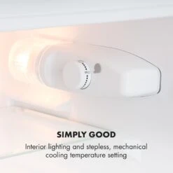Bestückt mit zwei herausnehmbaren Glas-Einschüben und einem 61 Liter Kühlschrank bietet er genug Platz für alle frischebedürftigen Lebensmittel eines Ein- bis Zweipersonenhaushalts. Flaschen, Dosen und Snacks finden in zwei separaten Türdepots einen geeigneten Aufbewahrungsort, während frisches Gemüse im herausnehmbaren Crisperfach eingelagert wird. Das hält Gurken und Salat bei nahezu 0 °C wesentlich länger frisch und knackig. Tiefkühlgut hingegen findet seinen idealen Platz im 26-Liter-Gefrierfach, welches du separat öffnen und schließen kannst.