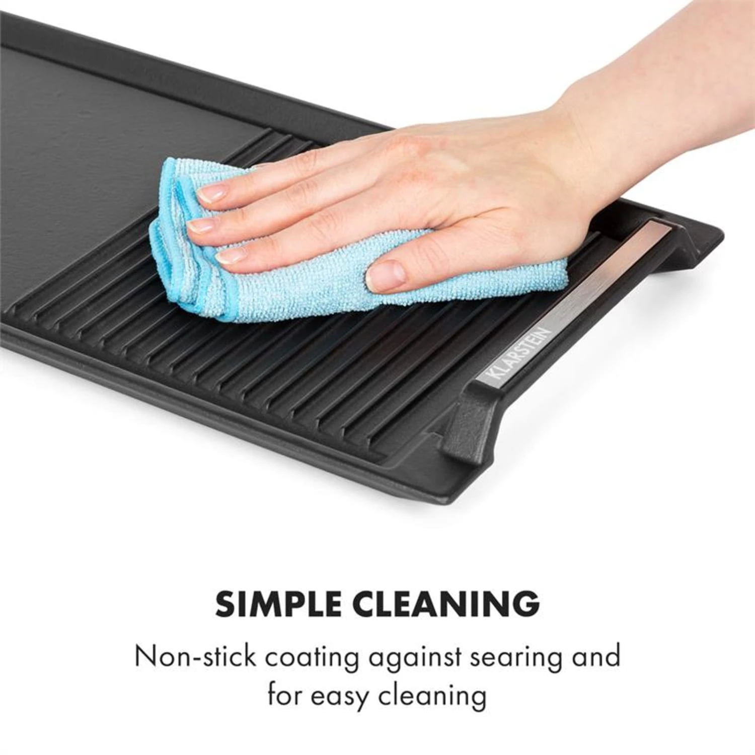 Die Klarstein Delicatessa Grill Pan Grillplatte ist die clevere Ergänzung für alle unsere Induktionskochfelder mit Flexzone. Einfach die Platte auf die Flexzone stellen und schon kannst du grillen wie die Profis – direkt an deinem Küchenherd zuhause! Damit die unterschiedlichen Grillspezialitäten auch perfekt gelingen, ist die Oberfläche der Grillplatte zur Hälfte mit Grillrippen und zur Hälfte mit einer glatten Bratplatte versehen. Mit 43,5 x 23 cm Größe steht dir genug Platz zur Versorgung der ganzen Familie oder deiner Freunde zur Verfügung. Damit beim heißen Vergnügen auch nichts anbrät und danach alles schnell wieder sauber ist, ist die Oberfläche mit einer praktischen Anti-Haft-Beschichtung versehen. Handgriff ermöglichen das einfache und sichere Versetzen der Platte, auch wenn sie heiß ist.