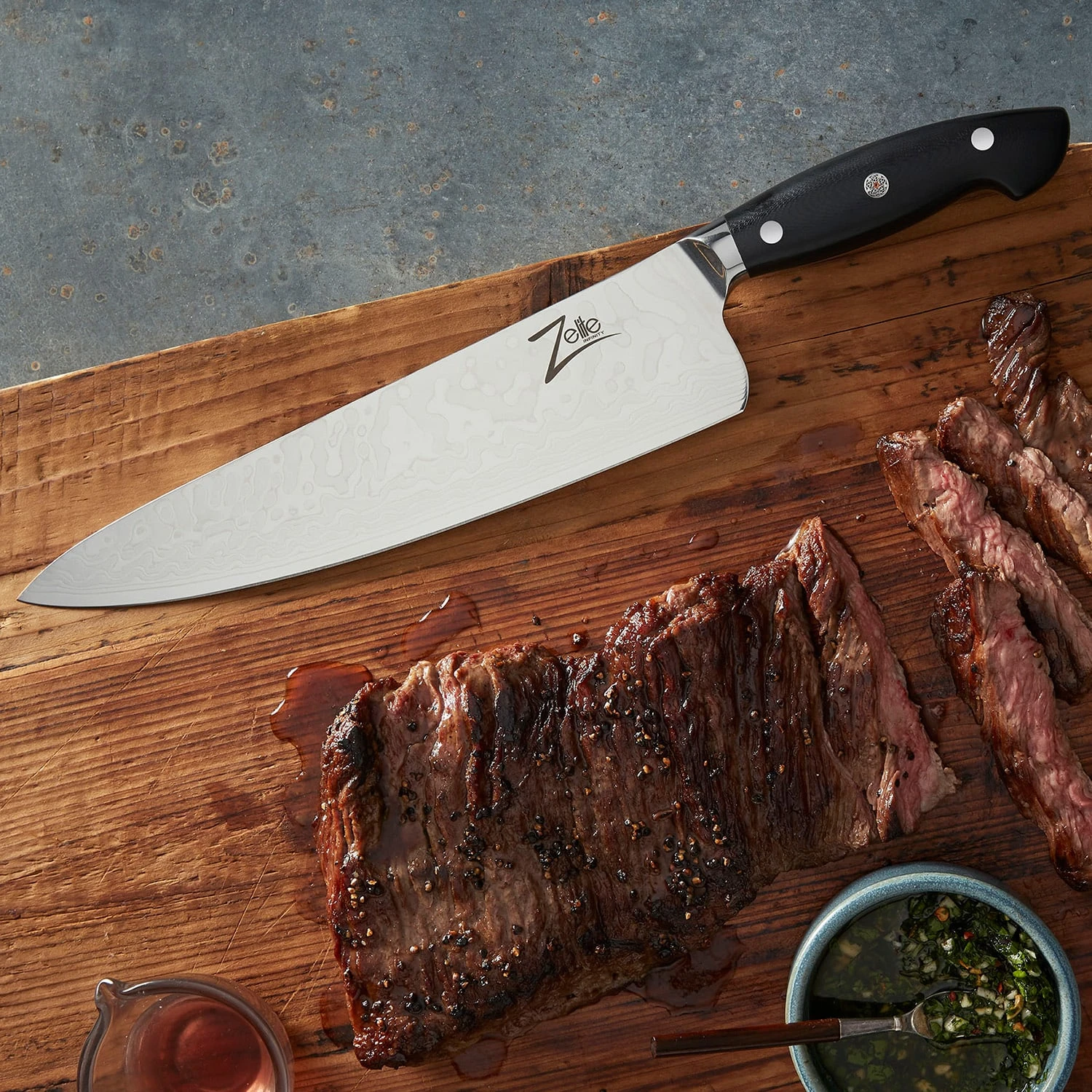 Unsere Spitzenserie wurde für passionierte Köche entwickelt, die nach Perfektion streben. Die Executive-Plus Messerserie von Zelite Infinity by Klarstein bietet herausragende Leistung und unvergleichliche Schönheit für jede Küche. Mit einem einzigartig gestalteten Griff mit Buckelrücken und ultratiefen Klingen aus 45-lagigem japanischem Premium-Damaszenerstahl.