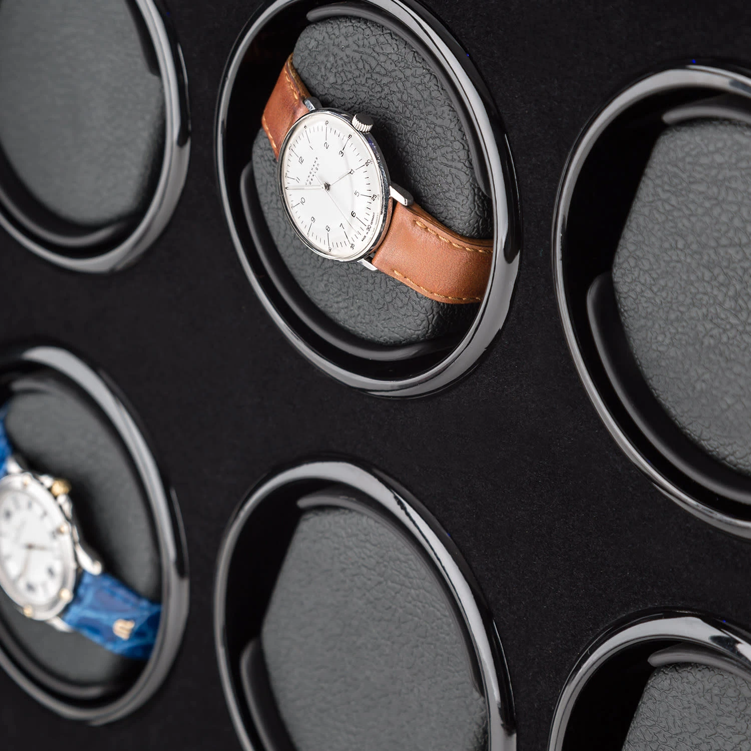 Der luxuriöse, schwarze Schaukasten des Klarstein KlagenfurtUhrenbewegers wartet mit zwölf Aufnahmen mit jeweils einem schwarzen Kissen auf, und setzt jede Uhr elegant in Szene. Das Schaumstoffmaterial stellt sicher, dass sowohl Chronometer mit langem als auch kurzem Armband festen Sitz finden. Die ebenfalls schwarze Samibespannung des Inneren vervollständigt den edlen Gesamteindruck. Eine Kunststofftür schützt die wertvollen Zeitmesser vor Staub und Schmutz, während eine einschaltbare, blaue LED-Beleuchtung für einen guten Einblick ins Innere sorgt. Zwei einfach verständliche, digitale Touch-Displays mit jeweils 6 Tastfeldern dient der separaten Steuerung der zwölf Rotatoren. So lassen sich für jede Aufnahme einzeln Rechts-, Links- oder Rechts-Links-Lauf sowie die gewünschten Umdrehungen pro Tag – bis 2200 – einstellen.