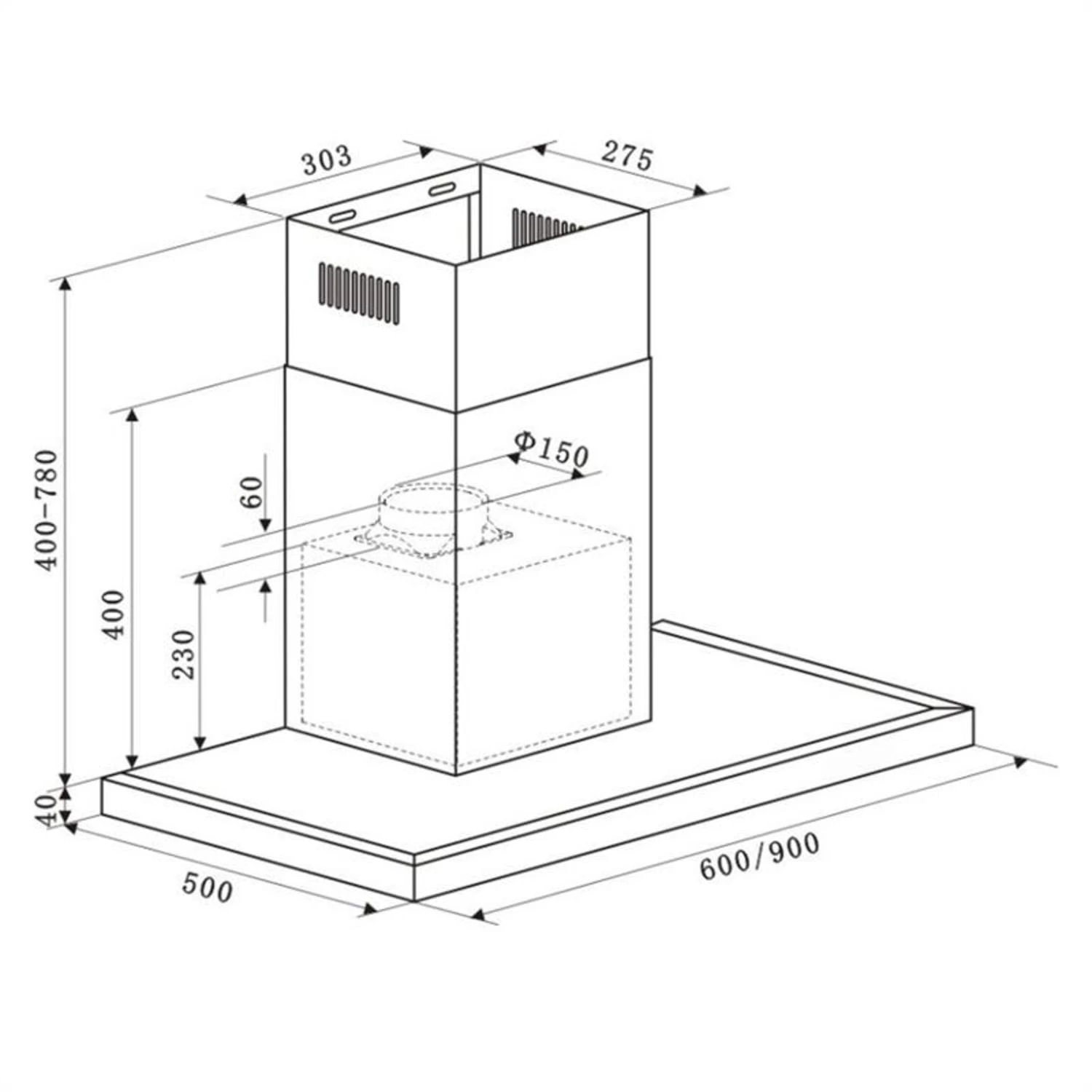 • Maße Haube (ohne Kaminverblendung): ca. 60 x 32 x 50 cm (BxHxT)
