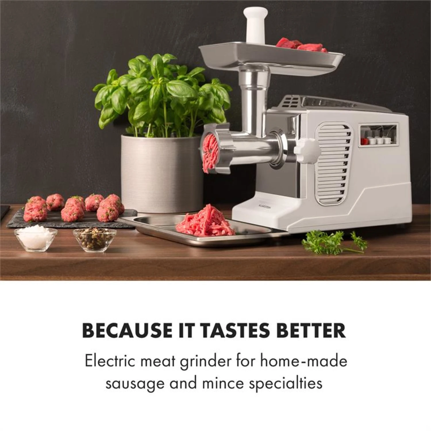 Wissen was drin ist: weil’s besser schmeckt! Der Klarstein Kraftprotz Fleischwolf steht ganz im Zeichen von Wurst- und Hackfleischspezialitäten aus der eigenen Küche.