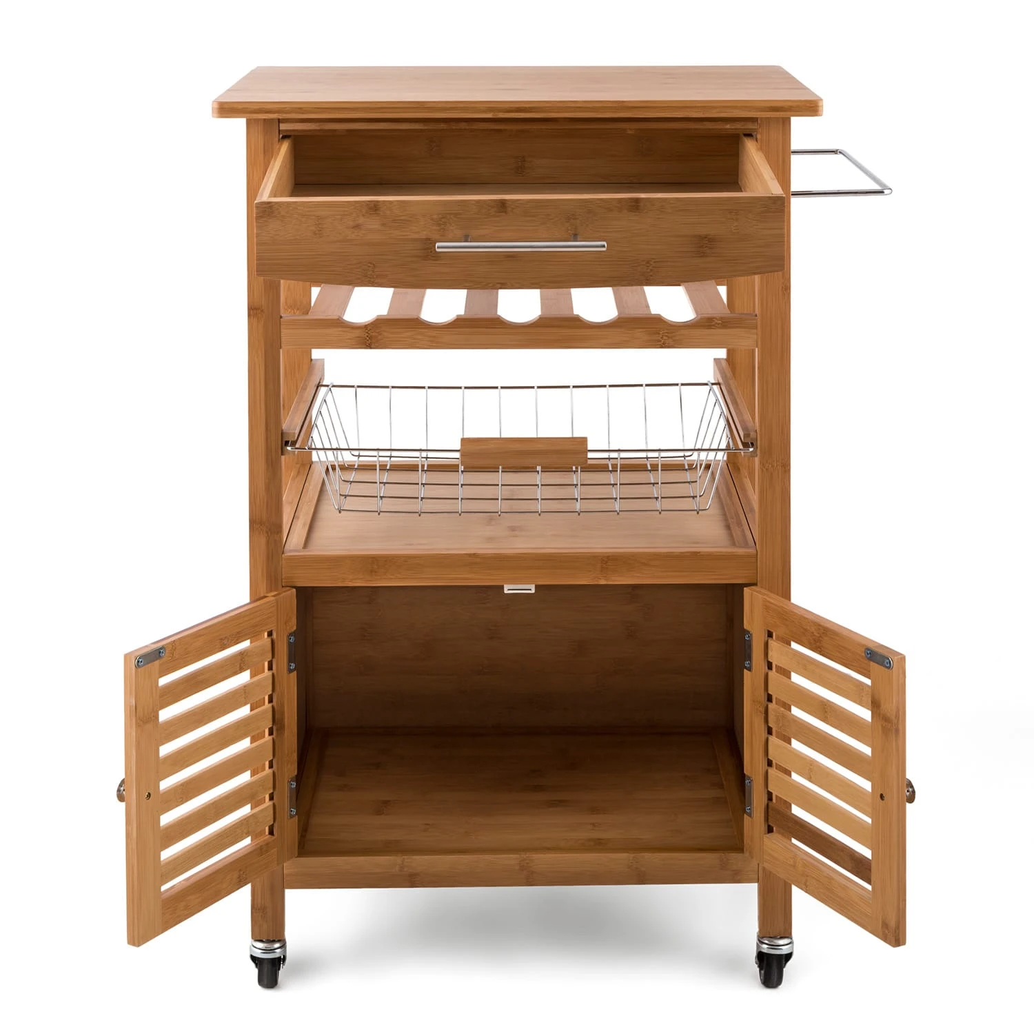 Ein Platz für alles: Auf fünf Etagen bringst du im Klarstein Louisiana Servierwagen Geschirr, Vorräte, Flaschen, Besteck und Küchengeräte gut geordnet unter. Dafür sorgen die große Arbeitsplatte, eine topseitige Schublade, ein Weinregal für bis zu vier Flaschen, eine Obstschütte und ein kleines Schränkchen. Zum Anrichten stehen dir gleich 2400 cm² auf der edlen Arbeitsplatte zur Verfügung, um fertige Speisen an den Tisch zu fahren oder dort direkt vorzubereiten. Dank Hartgummirollen gleitet der Servierwagen leichtgängig sogar über Teppichböden. So verrichtet der Küchenbutler freudig seine Dienste als Anrichte oder Beistelltisch.