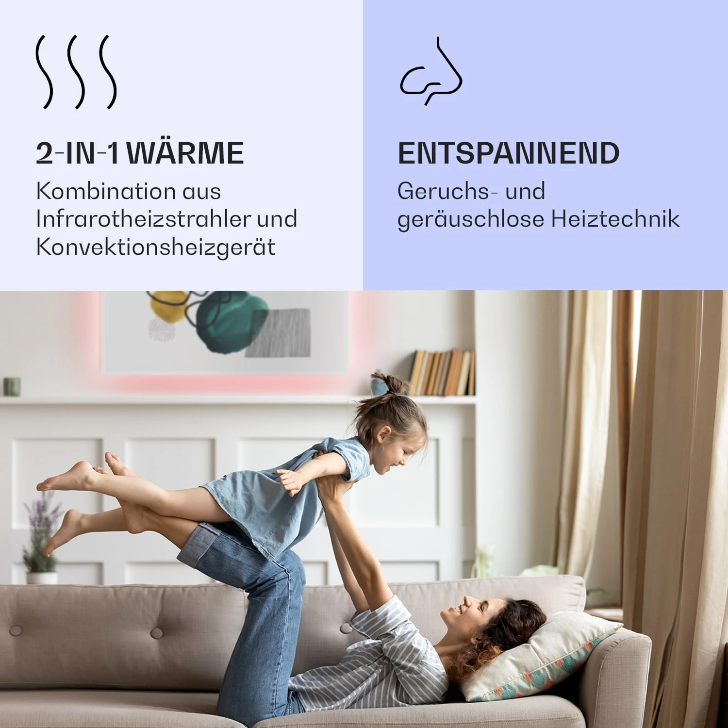 Doppelte Leistung bei gleicher Größe, die Klarstein Mojave 2-in-1 Heizgeräte vereinen geschickt einen Infrarotheizstrahler mit einem Konvektor und schaffen so in platzsparender Bauweise nicht nur schnell fühlbare Infrarot-Wärme, sondern erzeugen auch kuschlig warme Raumluft über rückseitig aufsteigende Wärme. Dabei hast du, passend zur Größe deines Raums, die Wahl zwischen einem 500, 750 oder 1000 Watt starken Heizgerät. Das gradweise einstellbare Thermostat und der Wochentimer werden dabei ganz smart via Klarstein-App oder per Fernbedienung gesteuert. Dank IP44 Sicherung sind die Konvektoren auch bestens fürs Bad geeignet. Ganz egal wo du dein neues Klarstein Mojave Smart Heizpanel aufhängst, mit seinem farbigen RGB-Ambientelicht erzeugt es überall die passende Atmosphäre.
