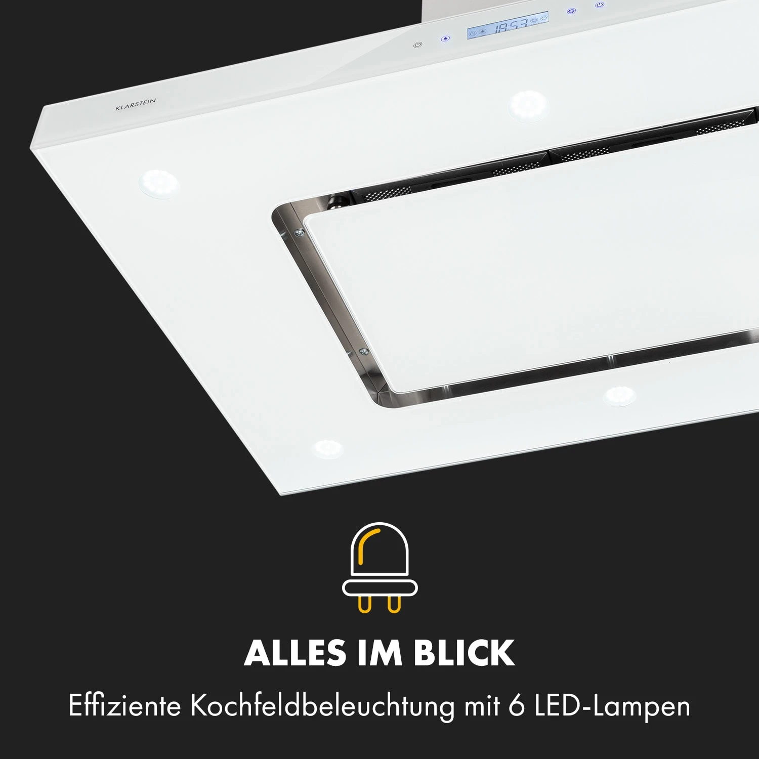 Schönste Effizienz: Die Klarstein Valeria Inselabzugshaube befreit Küchen von Dunst und Dampf und bereichert sie um einen edlen Blickfang in einem glänzenden Kleid aus Edelstahl mit luxuriösen Glaselementen an Front-, Rück- sowie der Haubenunterseite.