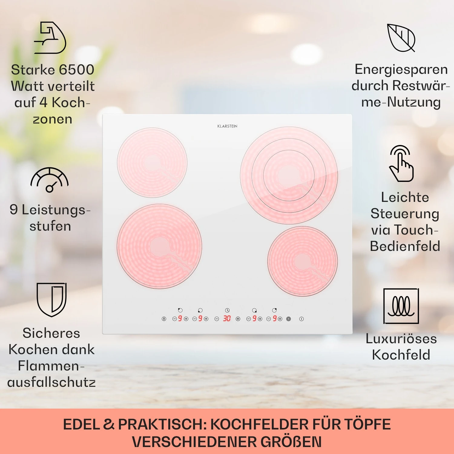 Das Klarstein Virtuosa 4 Keramikkochfeld verbindet moderne Technik mit luxuriösem Aussehen und bringt neuen Glanz in deine Küchenzeile.
