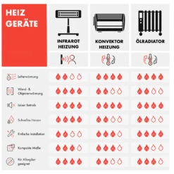 - Infrarotwärme: erwärmt angestrahlte Personen und Gegenstände, keine direkte Luftaufheizung